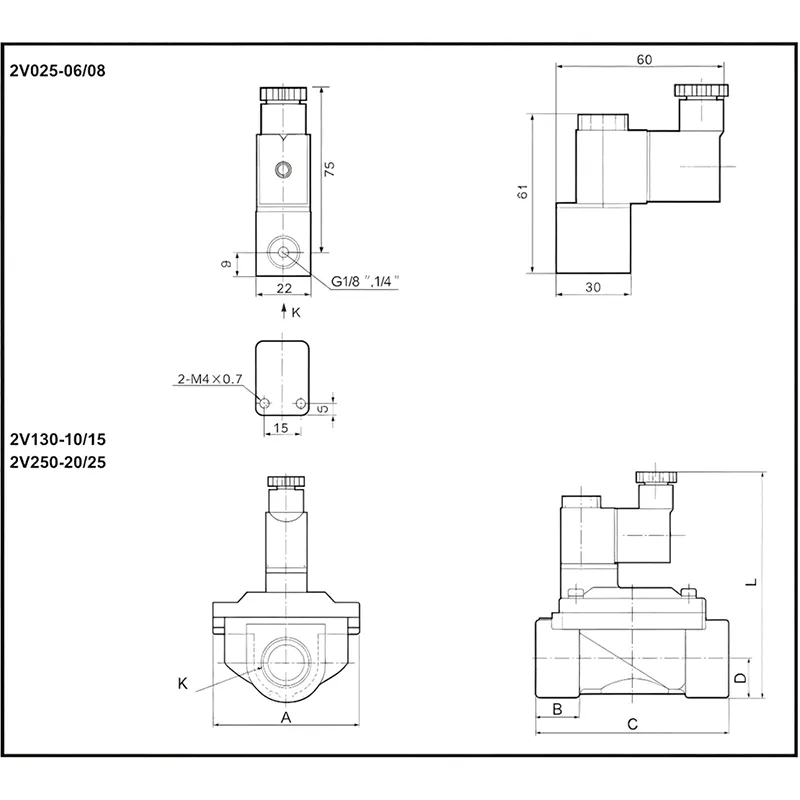 2V series solenoid valves includes the 2V025 direct-acting solenoid valve and the 2V130 / 2V250 pilot-operated solenoid valves.